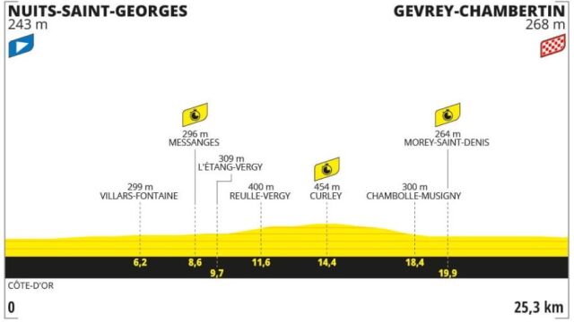 La contrarreloj individual de este viernes tiene como principal dificultad la subida de Curtil-Vergy (1,6 km a un 6,1%), cuyo alto se sitúa a 11 kilómetros de la llegada en Gevrey-Chambertin.