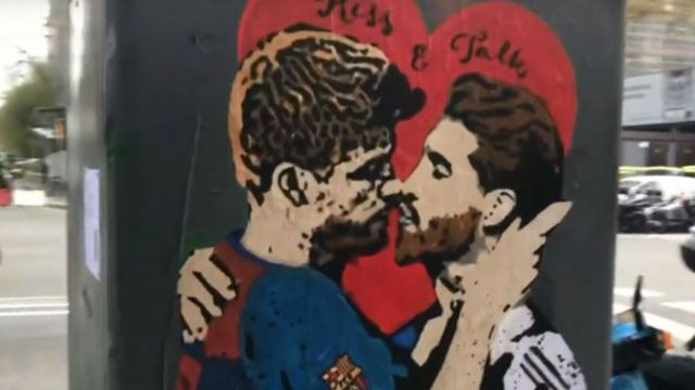 Todos los que pasen por el paseo de Gracia de Barcelona podrán ver la obra titulada 'Spain, kiss and talk' (España, besar y hablar), del artista Tvboy, un grafiti que retrata un beso entre el barcelonista Gerard Piqué y el madridista Sergio Ramos. La obra trata de reclamar el diálogo entre Cataluña y España a pocas horas de la disputa del Clásico entre el Barcelona y el Real Madrid. Tvboy ya hizo otros grafitis similares, como el beso entre Messi y Cristiano Ronaldo o el de Carles Puigdemont y Mariano Rajoy.