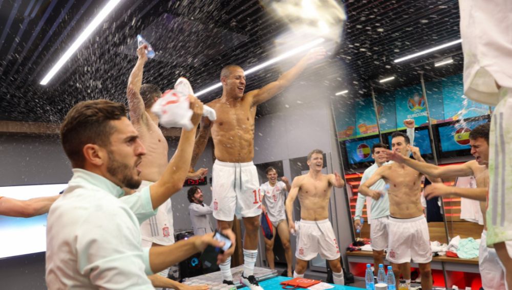 La fiesta continuó en los vestuarios, todos los jugadores comenzaron a celebrar el pase a la siguiente ronda con cervezas, baños de agua, gritos, ondenando la camiseta... Incluso el presidente de la RFEF, Luis Rubiales, estuvo en los vestuarios y se mostró jubiloso, al igual que Luis Enrique.