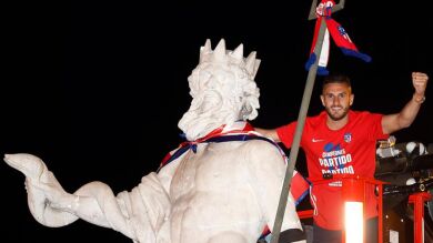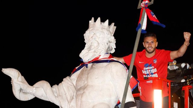 Los jugadores del Atlético de Madrid acudieron por la noche a la Plaza de Neptuno para que Koke colocara la bandera rojiblanca al dios Neptuno.