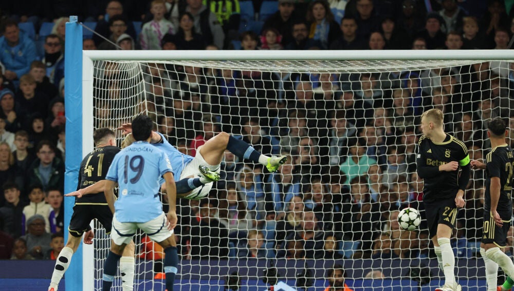 Erling Haaland deslumbró anoche a toda Europa con uno de esos goles que se recuerdan durante muchos años y que siempre estará en los recopilatorios de los mejores goles de la Champions League. El Manchester City aplastó (5-0) al Sparta de Praga y lo hizo con dos goles del delantero noruego, el primero de ellos una auténtica obra de arte. Y es que el ariete nórdico se inventó un remate de espuela de espaldas, al más puro estilo Zlatan Ibrahimovic, para mandar a la red un centro de Savinho.
