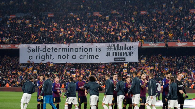La política volvió a colarse en un partido de fútbol. Una gran pancarta con el mensaje 'La autodeterminación es un derecho, no un crimen' estuvo presente durante la presentación de los equipos antes del Clásico que enfrentó a Barcelona y Real Madrid.