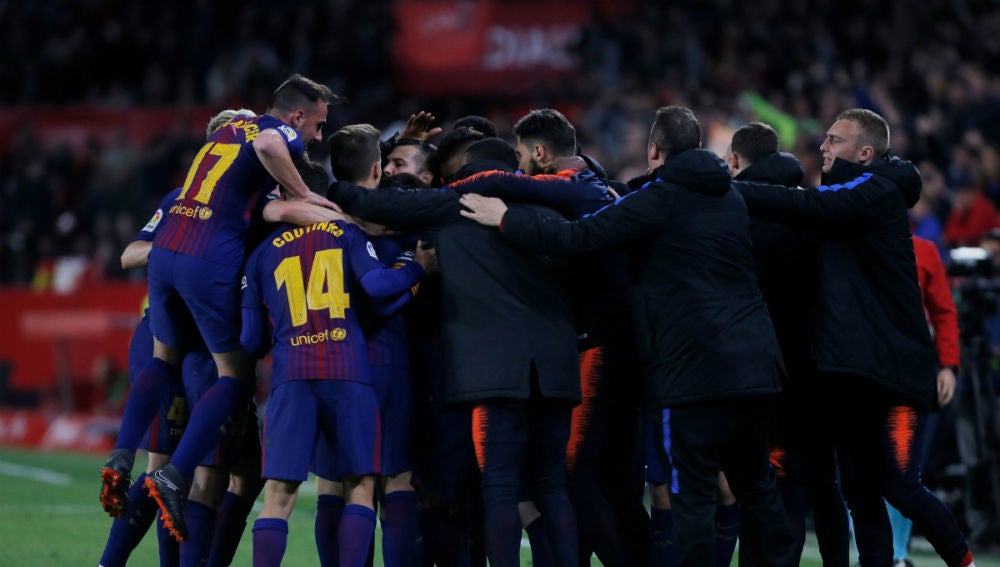 En apenas 53 segundos, el Barça equilibró el partido. Primero marcó Luis Suárez, a la salida de un saque de esquina en el minuto 88, y prácticamente después de sacar de centro, Leo Messi decidió con un remate junto a la base del poste derecho de la meta de Sergio Rico.