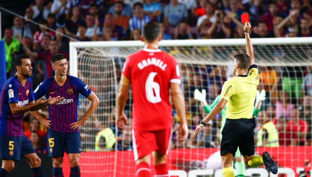 El colegiado del encuentro, Gil Manzano, tuvo que ir, él mismo, a revisar la jugada polémica al monitor situado en el césped del Camp Nou, después de que Del Cerro Grande le instara a ello desde la sala VAR, y tras ello decidió expulsar al central.