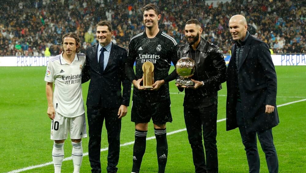 Fueron Luka Modric y Zinedine Zidane, dos Balones de Oro con la camiseta blanca, quienes se lo entregaron. Por su parte, Courtois también ofreció el Trofeo Yashin, recibido de las manos de Iker Casillas y que le acredita como el mejor portero de la pasada temporada. Precisamente hoy volvía el belga tras seis partidos ausente debido a una ciatalgia.