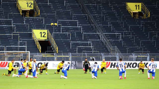 Los jugadores del Borussia Dortmund y el Hertha de Berlín protestaron de esta forma contra el racismo y la muerte de Geroge Floyd a manos de un policía en Estados Unidos.