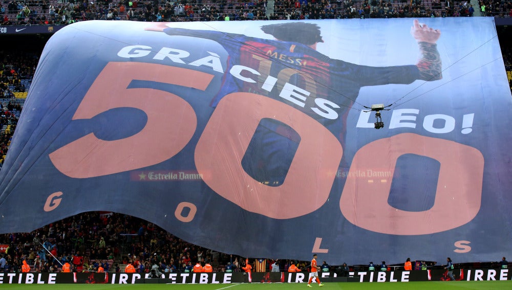 Los aficionados del Barcelona han aprovechado los prolegómenos del partido contra el Osasuna, que se disputa en el Camp Nou, para homenajear los 500 tantos como azulgrana del argentino Lionel Messi con una inmensa pancarta que ha ocupado dos de los tres graderíos de la zona lateral del estadio.