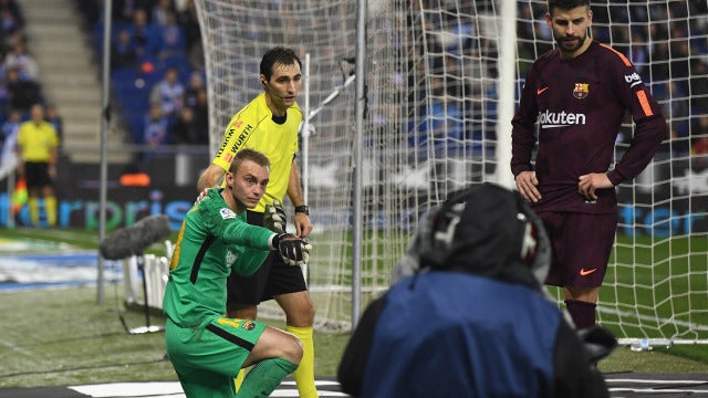 Cillessen sufrió el impacto de un objeto lanzado desde la grada en Cornellá. Durante la segunda mitad del Espanyol-Barça, y cuando el portero azulgrana se disponía a buscar un balón para sacar, recibió el golpe.