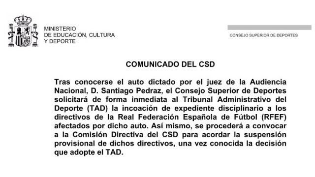 El Consejo Superior de Deportes, tras conocerse el auto dictado por el juez de la Audiencia Nacional, Santiago Pedraz, ha anunciado este jueves que solicitará "de forma inmediata al Tribunal Administrativo del Deporte (TAD) la incoación de expediente disciplinario a los directivos de la Real Federación Española de Fútbol (RFEF) afectados por dicho auto".