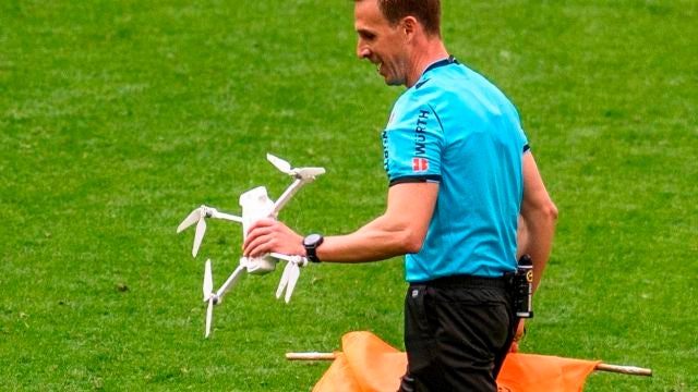 En medio del partido que enfrentaba al Athletic de Bilbao y al Levante un dronha caído en el césped de San Mamés en el minuto 67, suceso que ha obligado al árbitro a parar el encuentro unos segundos hasta retirar el aparato del terreno de juego. El árbitro principal recorrió el campo con el dron en la mano y se lo entregó al delegado de campo.
