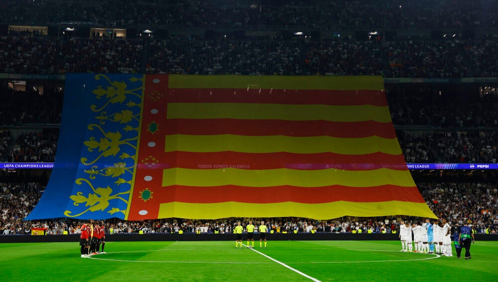 Una pancarta con el lema 'Valencia somos todos' y una gran bandera de la Comunidad Valenciana presidió un sentido minuto de silencio previo al Real Madrid - AC Milan.