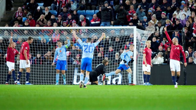 La temida visita a Oslo, donde esperaba el goleador Erling Haaland, fue más plácida de lo previsto inicialmente. España dominó buena parte del choque, liderada por un omnipresente Rodri, y el equipo nórdico, al que solo le valía la victoria, apenas inquietó los dominios de Unai Simón. Álvaro Morata pudo adelantar a los de Luis de la Fuente en la primera parte, pero su gol fue anulado por un fuera de juego revisado por el VAR. Carvajal rozó el gol con un lanzamiento de exterior que se fue por muy poco a la izquierda de la meta noruega.