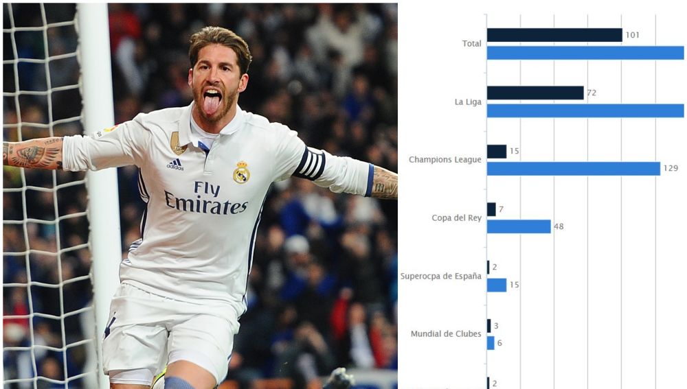 Ramos ha jugado 469 partidos de Liga con el Real Madrid anotando 72 goles, mientras que en Champions League sus números son de 129 partidos y 15 goles, con mención especial al logrado en el minuto 93 de la final ante el Atlético de Madrid.