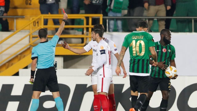 Esto propició el empuje de los turcos, que perdonaron el empate a los 57 minutos al enviar Guray Vural al poste derecho de Vaclik un penalti cometido por Sergi Gómez, que fue expulsado al ver su segunda amarilla, sobre Manu. Con un jugador menos y aún por delante en el marcador por esa acción afortunada para sus intereses, los sevillistas no supieron gestionar la situación y, sin apenas llegadas al área local, se vieron agobiados por la insistencia ofensiva de un Akhisar.