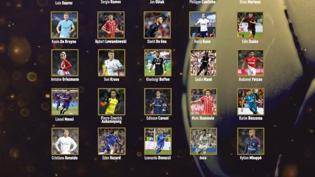 Los brasileños Coutinho (Liverpool), Marcelo (Real Madrid) y Neymar (París Saint-Germain), el belga Dries Mertens (Nápoles), el croata Luka Modric (Real Madrid), el argentino Paulo Dybala (Juventus) y el francés N'Golo Kanté (Chelsea) también figuran en la lista.