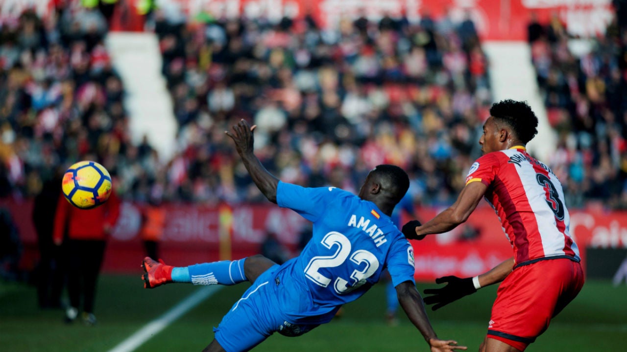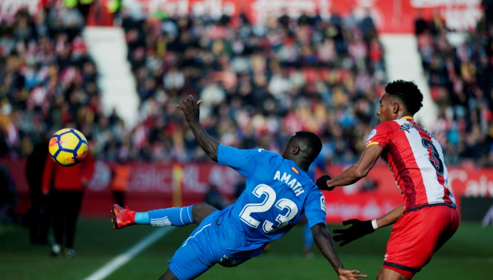 Antes del descanso, el conjunto de José Bordalás se ha acercado dos veces más al área del Girona por mediación de Amath Ndiaye, primero, y de Ángel Rodríguez, después.