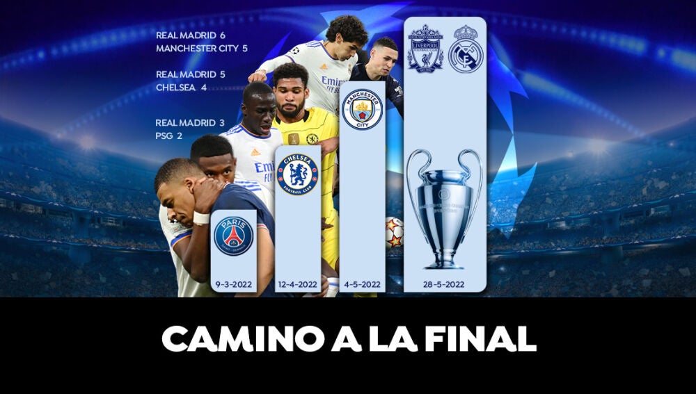 El camino del Real Madrid para llegar a la final de la UEFA Champions League 2022 ha estado marcado por la épica de las remontadas contra PSG, Chelsea y City. A continuación, puedes ver cómo han sido esas remontadas a través de gráficos.