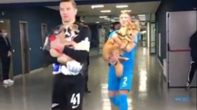 Es sin duda la imagen más tierna del fin de semana en el mundo del fútbol. Los jugadores del Zenit de San Petersburgo han salido al campo con perros en los brazos para apoyar la adopción de estos caninos.