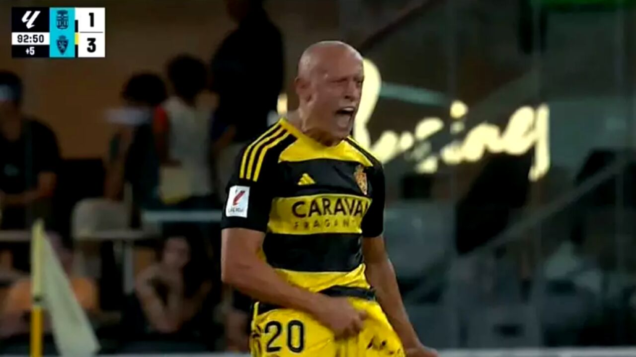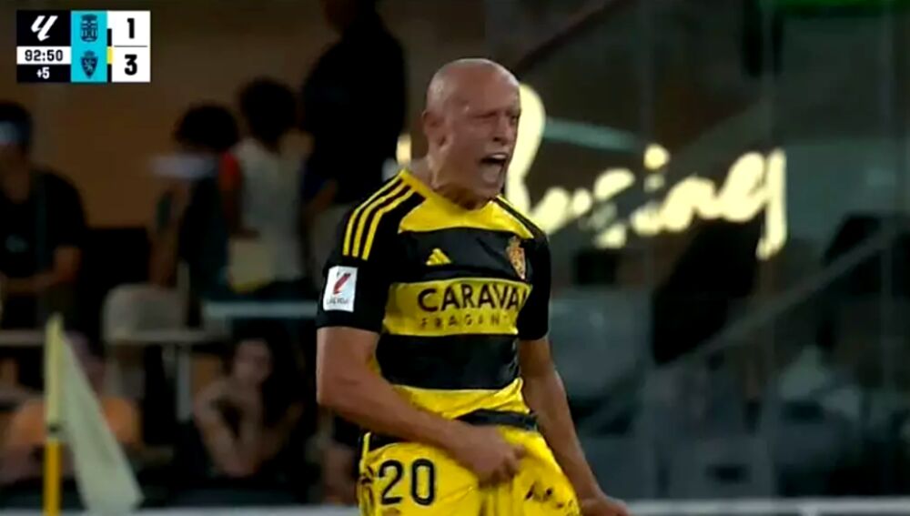 El delantero del Zaragoza celebró su gol en el descuento con la mano en los testítulos. Mollejo ya ha pedido disculpas.