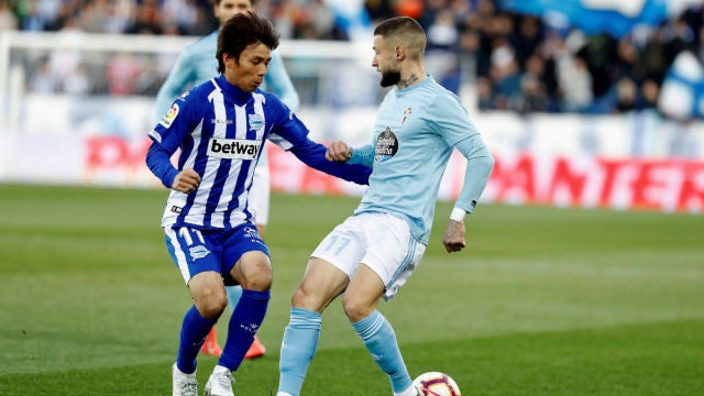 En el 30 dio la respuesta uruguayo Maxi Gómez con un disparó desde la frontal del área, que atrapó Pacheco sin problemas, en el primer tiro a puerta de los gallegos. El japonés Takashi Inui, que cumplía cien partidos en Primera División, era el más activo en los ataques del Alavés y aunque se alternó de banda con Jony Rodríguez, no lograba culminar sus conducciones.