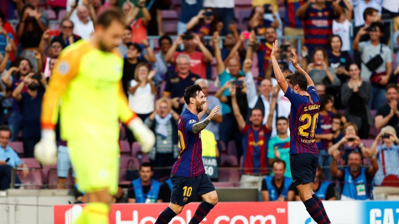 El delantero argentino comandó al Barcelona en su debut en la Champions con tres goles, el primero un magistral lanzamiento de falta. Dembélé, en un gran estado de forma, marcó ante los de Van Bommel. Umtiti fue expulsado por doble amarilla.