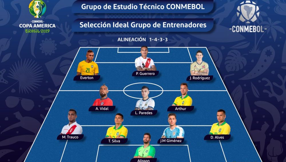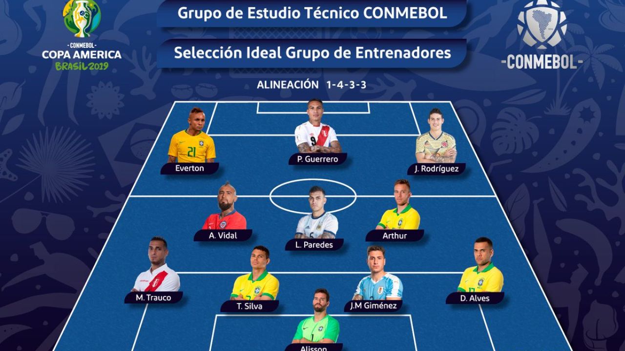 Brasil, la campeona de la Copa América, predomina con hasta cinco futbolistas en el once ideal de la Conmebol. El argentino Leo Messi y el uruguayo Luiz Suárez son la grandes ausencias.