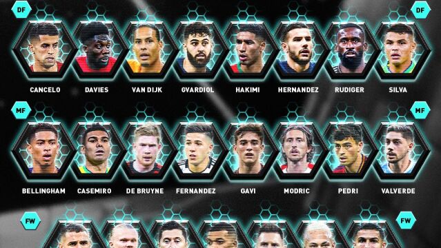 Defensas: Joao Cancelo (Manchester City/Bayern Múnich/Portugal), Alphonso Davies (Bayern Múnich/Canadá), Virjil van Dijk (Liverpool/Países Bajos), Josko Gvardiol (RB Leipzig/Croacia), Achraf Hakimi (PSG/Marruecos), Theo Hernandez (Milan/Francia), Antonio Rudiger (Chelsea/Real Madrid/Alemania), Thiago Silva (Chelsea/Brasil).