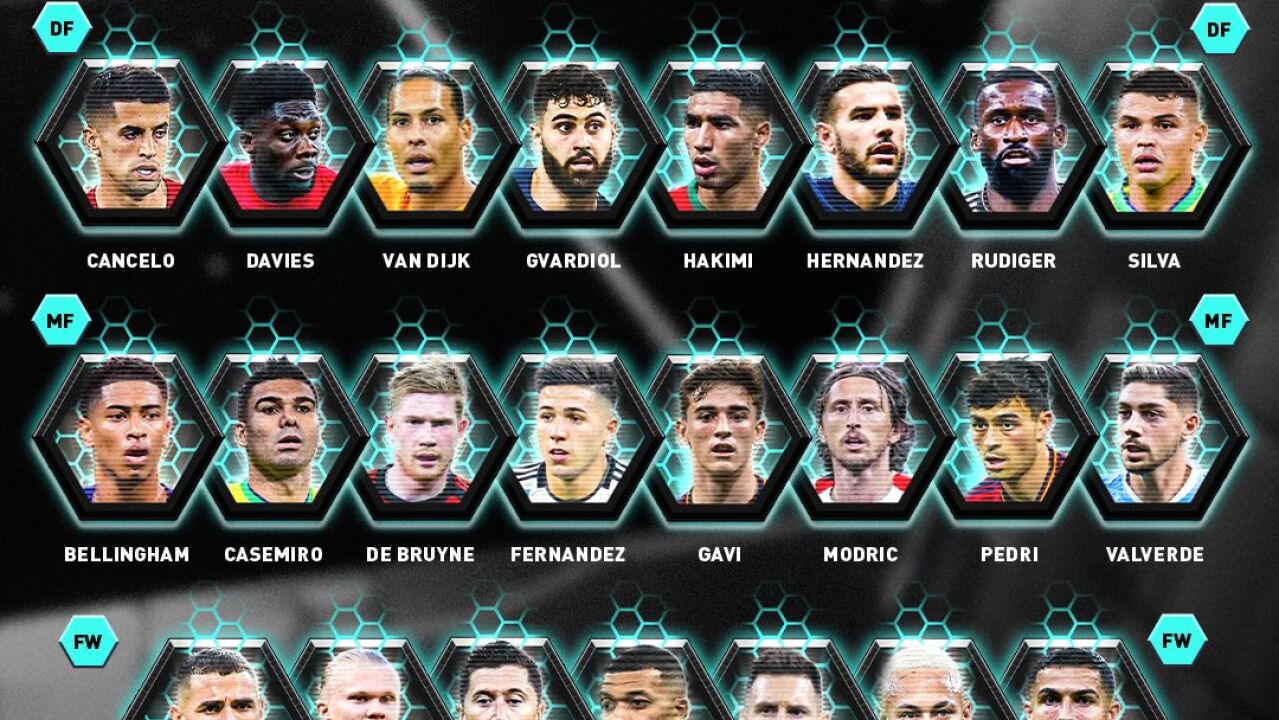 Medios: Casemiro (Real Madrid/Manchester United/Brasil), Jude Bellingham (Borussia Dortmund/Inglaterra), Kevin de Bruyne (Manchester City/Bélgica), Enzo Fernández (River Plate/Benfica/Chelsea/Argentina), Gavi, Pedri (Barcelona/España), Luka Modric (Real Madrid/Croacia) y Fede Valverde (Real Madrid/Uruguay).