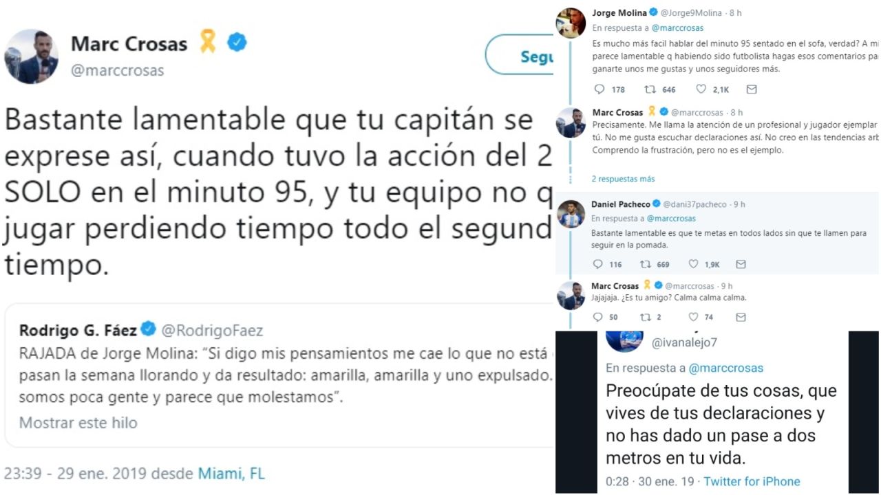 Una vez más Marc Crosas tuvo sus más y sus menos en twitter. Esta vez fue por criticar las protestas de Jorge Molina contra el arbitraje del Valencia-Getafe. Para el exfutbolista del Barcelona las palabras de Jorge Molina son "bastante lamentables" y recordó que el delantero tuvo en sus botas el 2-2.