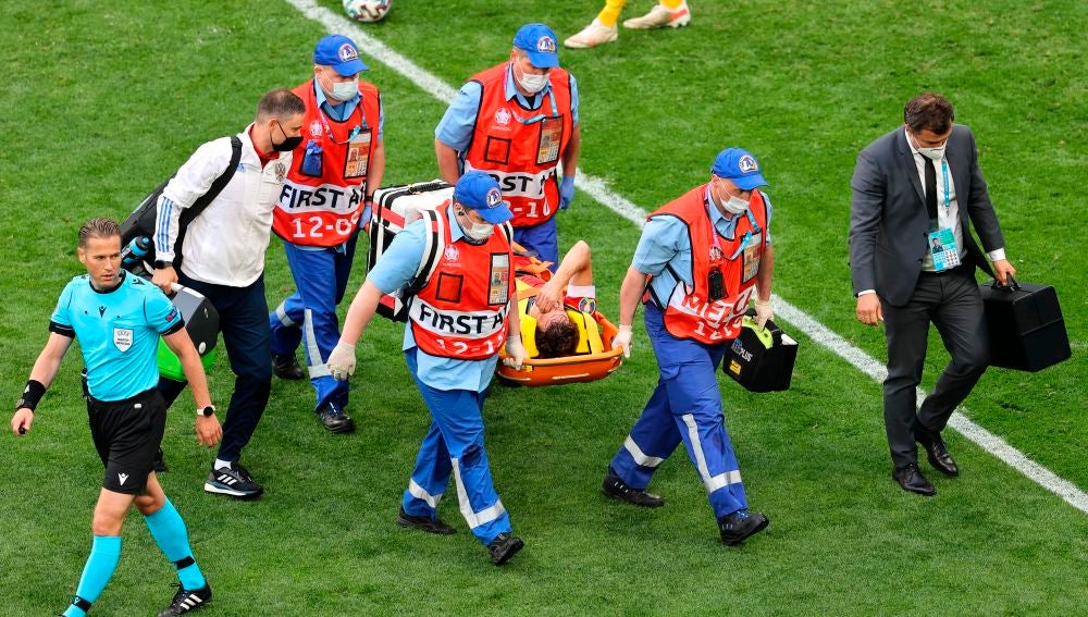 El lateral de Rusia protagonizó un nuevo susto al abandonar el terreno de juego en camilla y con collarín tras una terrible caída. La federación rusa ha confirmado que no sufre daños en la columna vertebral.