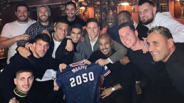 Mbappé celebra su 23 cumpleaños con varios compañeros de equipo del PSG. "Gracias por todos los mensajes y ese amor incondicional a diario", ha escrito el delantero francés en Instagram. Sergio Ramos, por ejemplo, publicó en sus 'stories' un vídeo en el que vemos a Kylian soplar las velas, mientras que Juan Bernat ha revelado con una foto el regalo que la plantilla le hizo: una camiseta con su nombre y los números del año 2050. ¿Troleo o presión para renovar con el Paris Saint-Germain?