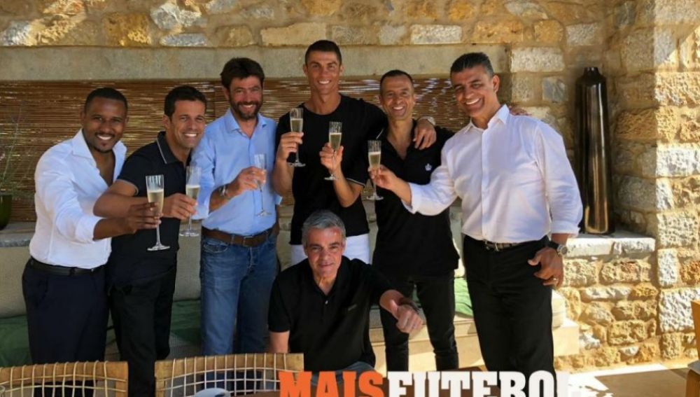 En la imagen se observa a Cristiano brindando junto al presidente de la Juventus y Jorge Mendes tras hacerse oficial su marcha al fútbol italiano.
