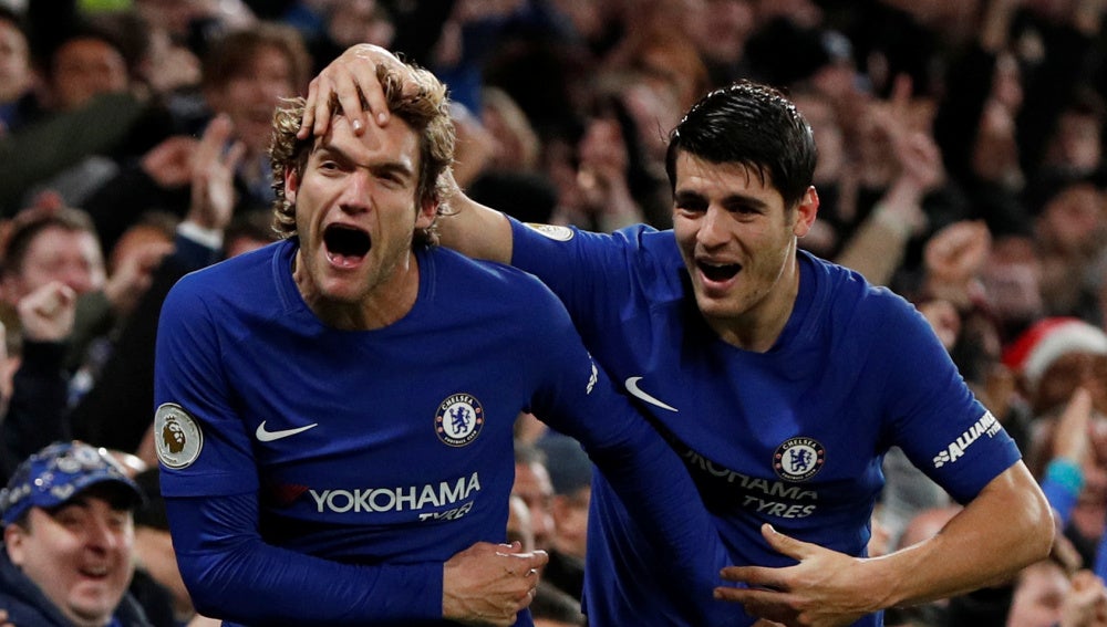Dos goles de cabeza de los españoles Álvaro Morata y Marcos Alonso, al rematar sendos servicios de sus compatriotas César Azpilicueta y Cesc Fàbregas, respectivamente, dieron el triunfo al Chelsea ante el Brighton (2-0) en la vigésima jornada (Boxing Day) de la Premier League inglesa de fútbol.