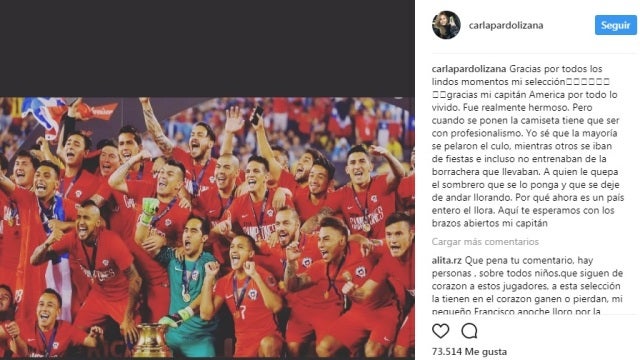 "Gracias por todos los lindos momentos mi selección, gracias mi capitán América (Claudio Bravo) por todo lo vivido. Fue realmente hermoso. Pero cuando se ponen la camiseta tiene que ser con profesionalismo. Yo sé que la mayoría se pelaron el culo mientras otros se iban de fiestas e incluso no entrenaban de la borrachera que llevaban. A quien le quepa el sombrero que se lo ponga y que se deje de andar llorando. Porque ahora es un país entero el que llora. Aquí te esperamos con los brazos abiertos, mi capitán", publicó Carla Pardo, la mujer del portero del Manchester City.