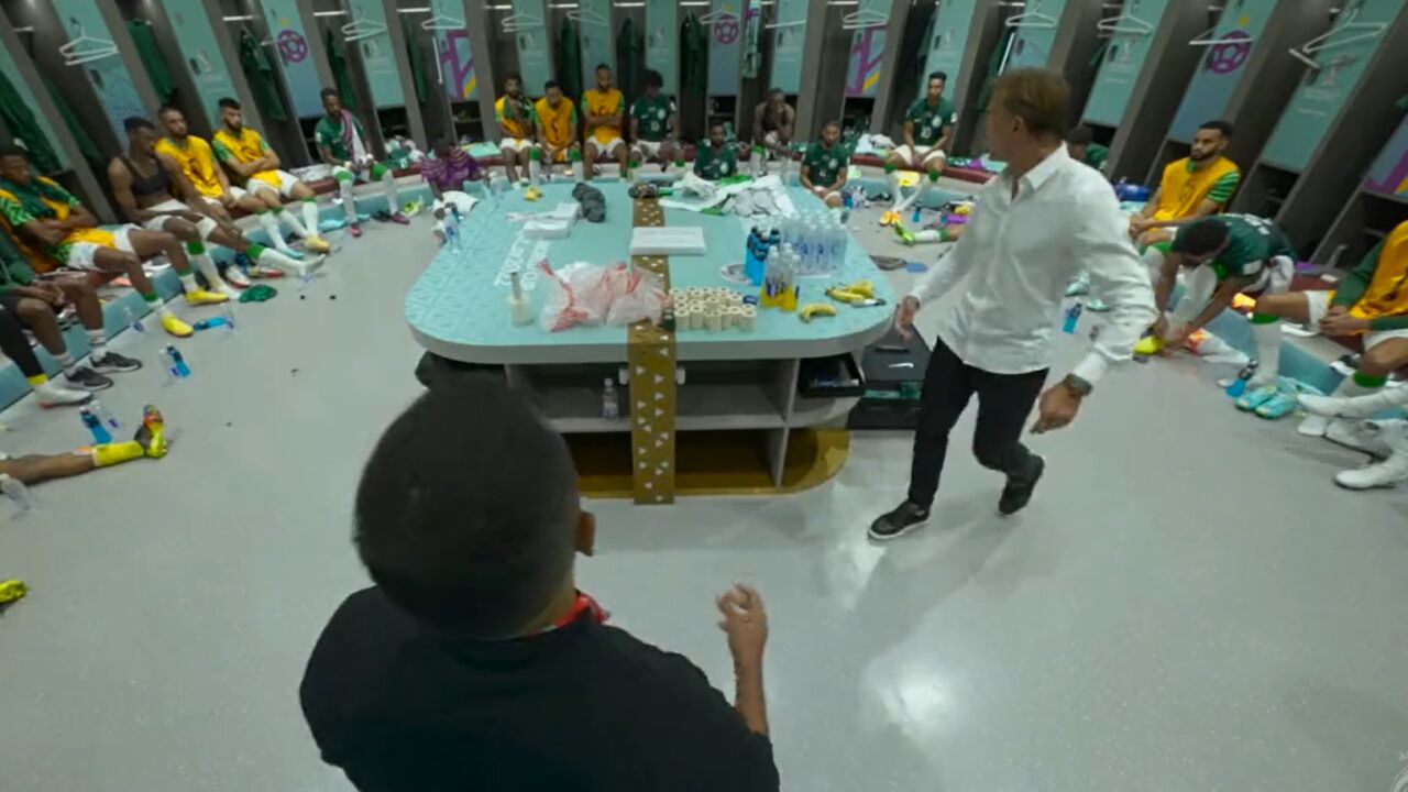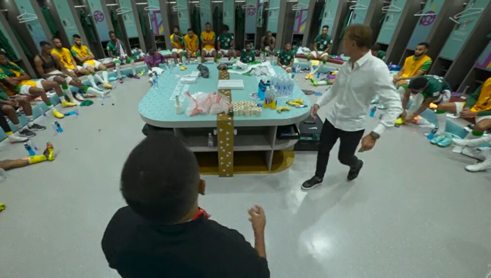 "¿Qué estamos haciendo aquí? ¿Esa es nuestra presión? La presión significa ir hacia arriba. Messi tiene el balón en el centro del campo y vosotros estáis quietos en defensa... coged el móvil si queréis y hacedle una foto. Tenéis que seguir a los delanteros. ¿No sentís nada? ¿No creéis que somos capaces de remontar? Están jugando relajados. Vamos chicos, vamos, esto es el Mundial, dadlo todo. ¡Tenéis que estar activos", así fue el discurso del galo, que mostró su enfado con aspavientos, gritos y un tono de voz imponente mientras que un integrante del staff saudí traducía del inglés al árabe.