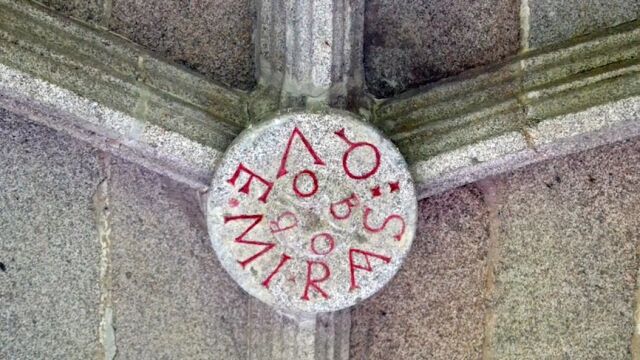 Todo apunta que esta inscripción forma parte de una broma con la que el cantero Pedro Rodrigues quiso reírse de los mirones, o bien iba dirigida a los monjes que abandonaban la meditación y miraban hacia arriba.