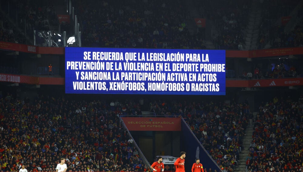 Durante el descanso, en el mensaje en el videomarcador del estadio se recordó que "la legislación para la prevención de la violencia en el deporte prohíbe y sanciona la participación activa en actos violentos, xenófobos, homófobos o racistas".