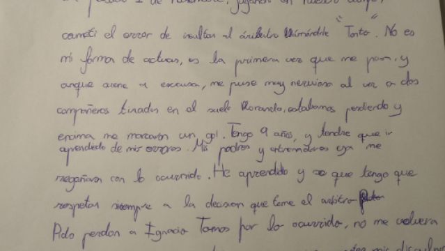 El pequeño confiesa en la carta que su expulsión durante tres partidos le parece "demasiado", aunque asume las consecuencias.