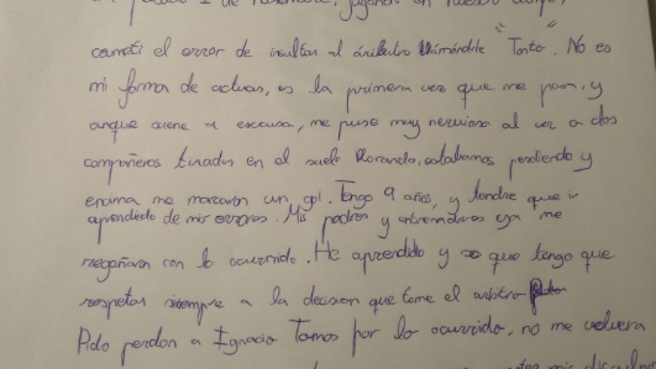 "Cometí el error de insultar al árbitro y llamarle 'tonto'. No es mi forma de actuar, es la primera vez que me pasa", explica el pequeño.