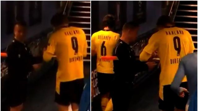 El árbitro rumano esperó en el túnel de vestuarios hasta que vio aparecer a ErlingHaaland y no dudó en pedirle que le firmara un autógrafo en las propias tarjetas, la amarilla y la roja. El delantero noruego no tuvo problema en detenerse con el juez de línea y dedicarle la firma.