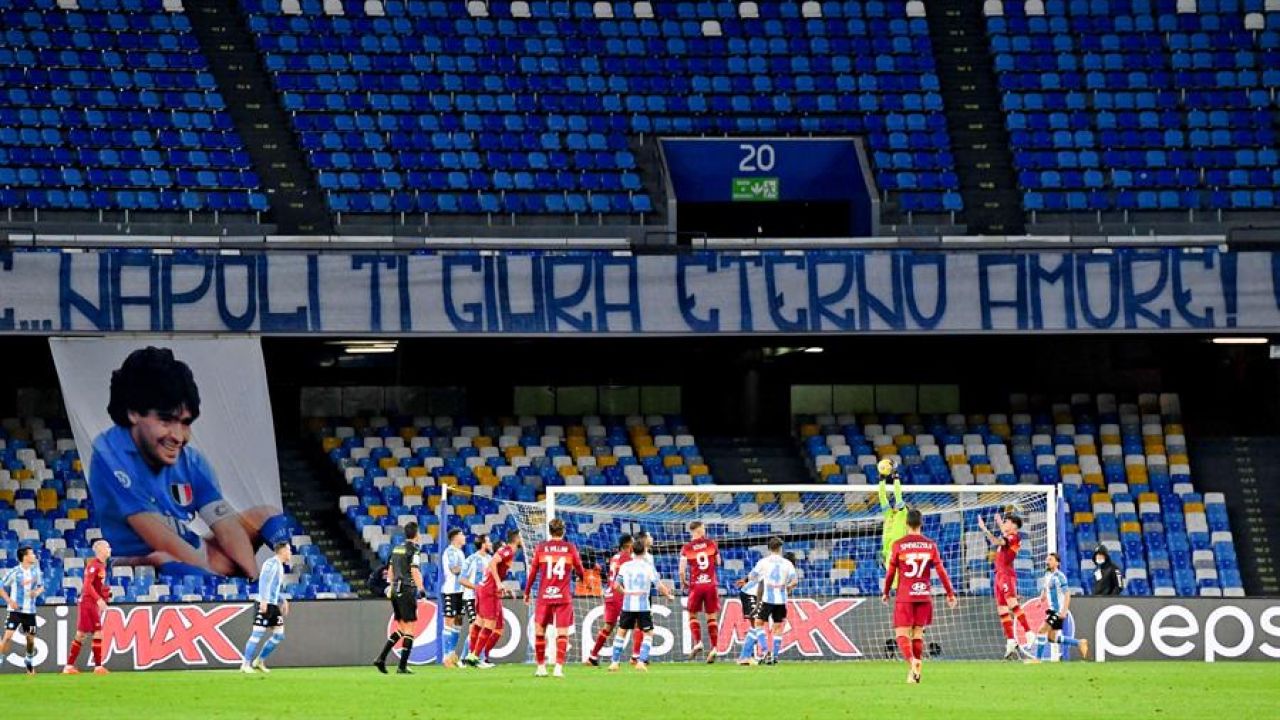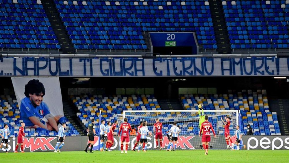 Y al llegar al minuto 10, como ya ocurrió en otros partidos de la novena jornada de la Serie A, el árbitro detuvo el juego para que los dos equipos y sus cuerpos técnicos brindaran un largo aplauso al Pibe de Oro.