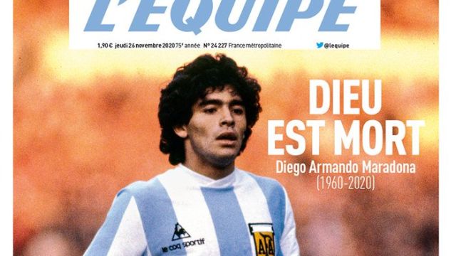 Los medios europeos también abren con la muerte de Diego Armando Maradona. Sobre todo en Italia, donde el futbolista se convirtió en una auténtica leyenda con estancia en el Nápoles. Por su parte, el diario francés L'Equipe señala que 'Dieu est mort' ('Dios ha muerto') en su portada.