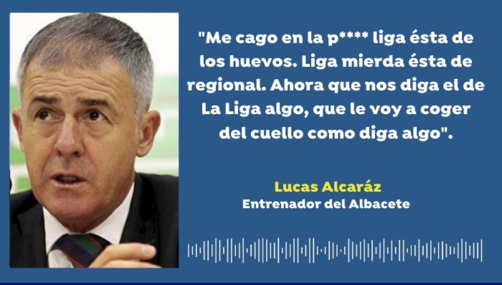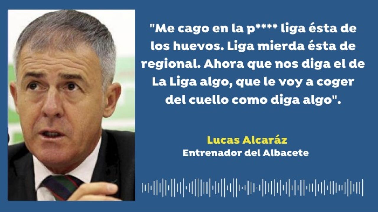 "Me cago en la puta Liga esta de los los huevos, en la Liga esta regional. Ahora que nos diga el de la Liga... que le voy a coger del cuello. ¿El recogepelotas dónde estaba? Ahora nada, ahora pollas. Ahora nos la comemos. Hemos estado haciendo 40 minutos el gilipollas. Que me diga algo este que lo reviento. Somos unos encajadores, solo nos falta poner el culo", espetó Alcaraz en la banda de Vallecas.