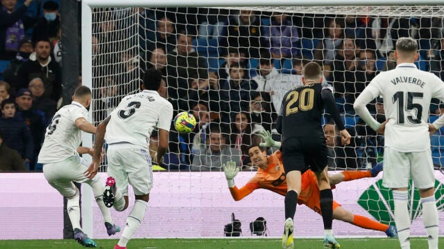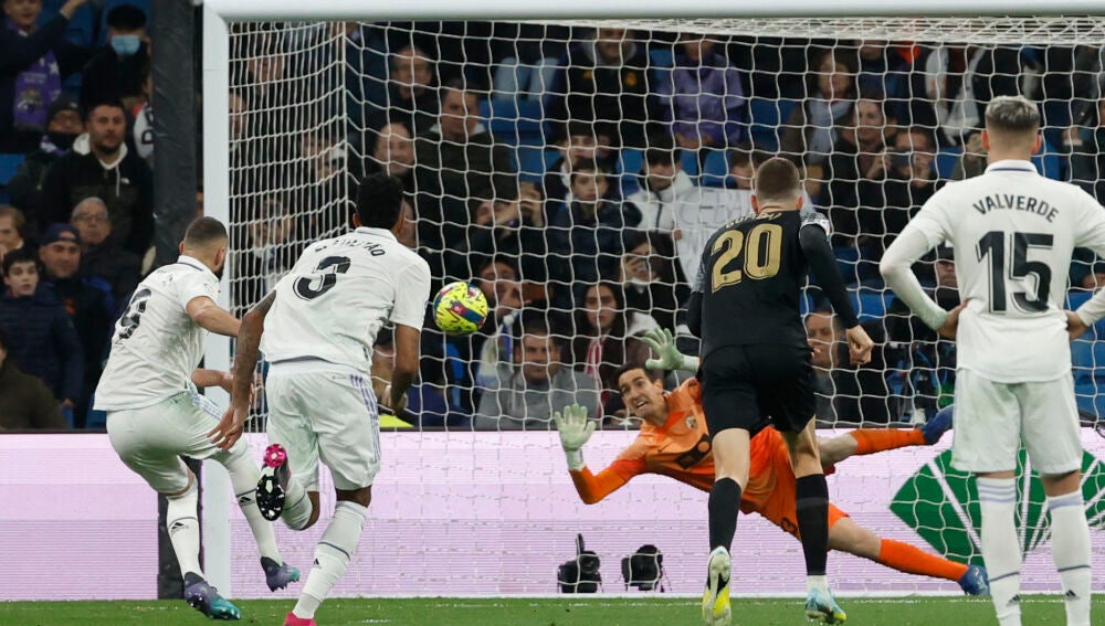Otra ocasión para Benzema. Esta vez tras una pase mirando a la grada de Rodrygo. El disparo de Karim se va desviado.
