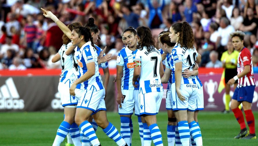 La Real Sociedad ya tiene su primeraCopa de la Reina.Las jugadoras de Arconada se han impuesto a un Atlético que sigue sin su particular doblete en un encuentro en el que las rojiblancas se adelantaron, pero que acabó con ellas derrotadas. Esther marcó el 1-0, pero las 'txuri urdin' le dieron la vuelta al marcador gracias a Palacios y a Nahikari.