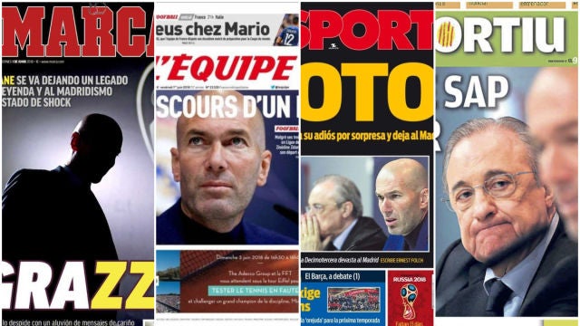 La dimisión de Zidane como técnico del Real Madrid acapara gran parte de las portadas nacionales e internacionales de los diarios deportivos. Repasamos los titulares que deja la marcha del francés.