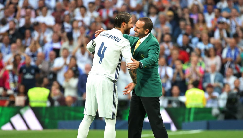 El golfista castellonense saltó al césped del Santiago Bernabéu entre los aplausos del público que llenó el estadio madridista. Vestido con la chaqueta verde que le acredita como campeón en Augusta, caminó desde el vestuario hasta casi el centro del campo, se abrazó con Sergio Ramos y golpeó la pelota aclamado por todo el estadio.