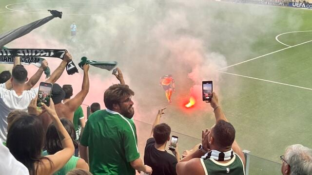 El partido de primera ronda de clasificación de Champions League tuvo que ser suspendido por el lanzamiento de bengalas y peleas entre aficionados.