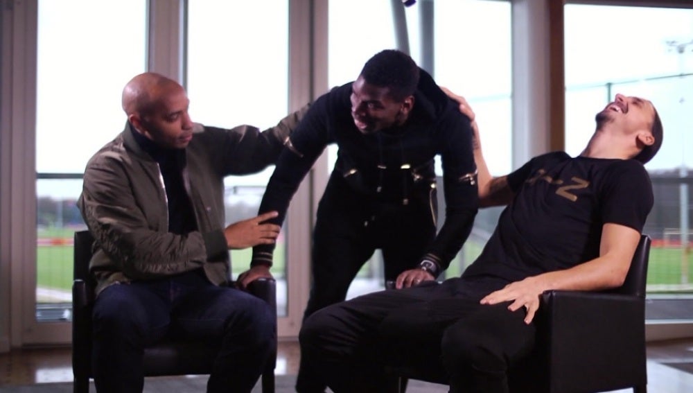 El delantero sueco invitó a su compañero de equipo a sentarse junto a él y Henry, pero lo hizo de una forma muy peculiar. "Si quieres sentarte entre dos grandes jugadores ven. Siéntate en el suelo", le indicó Ibrahimovic a Pogba mientras Henry no podía contener la risa.