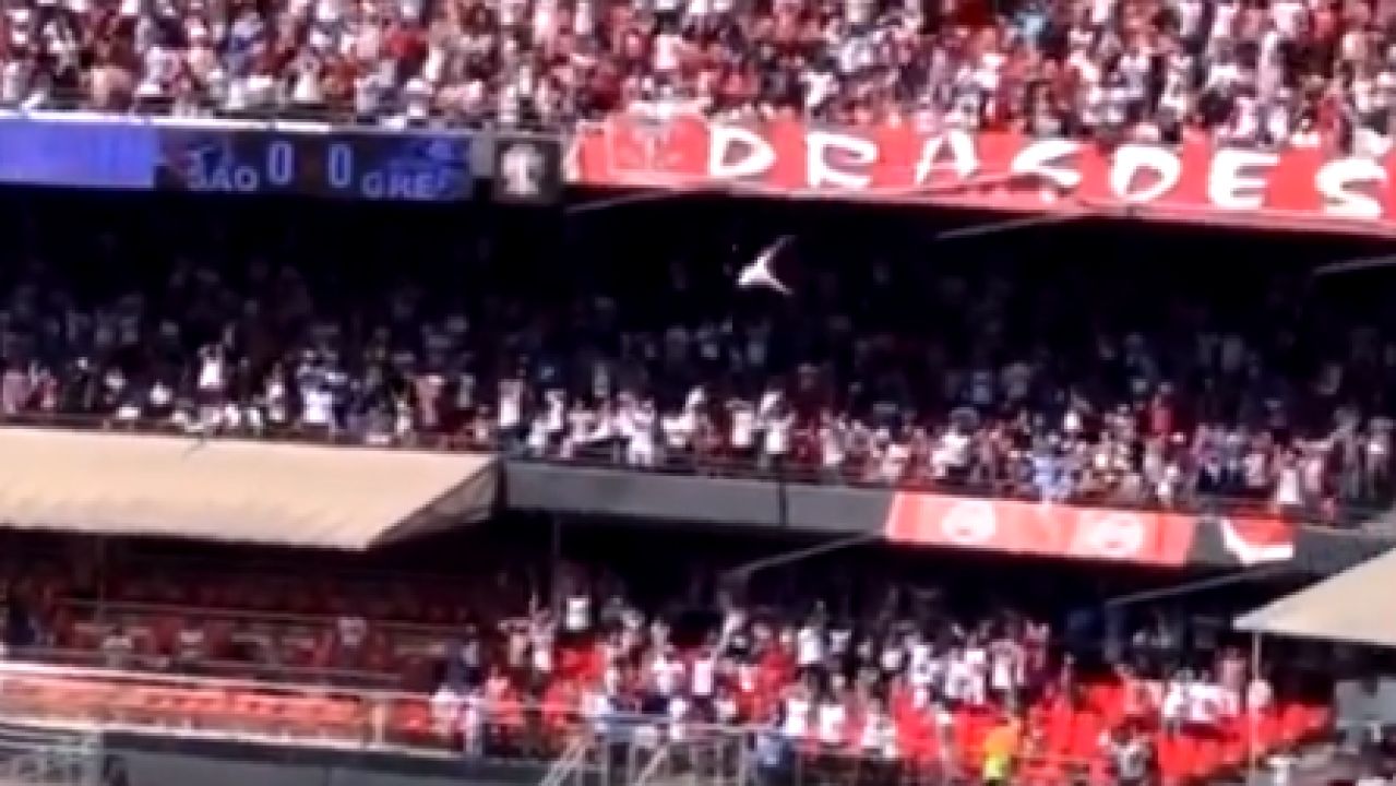 Ocurrió en un partido de la liga brasileña que enfrentaba al Sao Paulo y al Gremio de Porto Alegre. Un joven de 23 años cayó desde la grada más alta del estadio Morumbí y aterrizó sobre una niña de 13 años que se encontraba dos gradas más abajo.